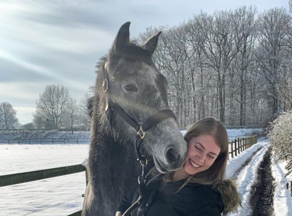Meine 7-jährige Trakehner Schimmelstute. Ich fand sie 2018 in einer Schlachtpferdegruppe auf Facebook und rettete sie in einer Nacht-und-Nebel-Aktion. Mit ihr erlebte ich wieder diese Leichtigkeit und tiefe Verbindung. Sie ist unglaublich lieb und weise, und ich hatte immer wieder das Gefühl, ihre Gedanken und Wünsche zu verstehen.